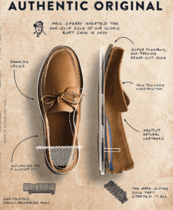 Il problema della scivolosità sembrava risolto. Fece un esperimento a bordo con un prototipo indossato da un giovane membro dell’equipaggio del suo schooner e la suola sembrò funzionare: aveva inventato le scarpe da barca. Sperry brevettò un sistema chiamato “razor siping” (intaglio a lama di rasoio) e cercò di vendere l’idea. Il taglio di scanalature nella suola del Top-Sider , in realtà, fu un’implementazione di un processo di incisione o intaglio (siping) di una suola di scarpe inventata e brevettata negli anni venti da John Sipe. Questo processo contribuì a massimizzare la trazione della scarpa da barca Sperry , introdotta per la prima volta nel 1935.